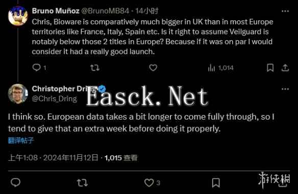在被问及欧洲整体销量时,Dring承认,开发商BioWare在英国确实拥有比欧洲其他地区更大的市场吸引力,因此《龙腾世纪4》在欧洲的销量可能会明显低于上述两款作品。但如果它在欧洲依然能达到相同水平,那么其表现将相当出色。不过,他也指出,“欧洲的数据需要更长时间才能统计完成”,因此再等待一周进行评判也不为迟。