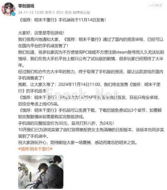 在公告中官方表示,《饿殍:明末千里行》通过了国内的资质审核,已经可以在国内平台的手机端发售了。而手机版本目前只有安卓端,后续会考虑上线IOS端。此外,手机端可以免费下载,下载后能免费试玩3个章节,如要解锁完整剧情体验需要购买完整版游戏。手机端的完整版定价为30元,首月打折八折,为24元。