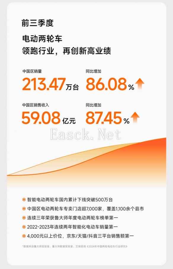 其中,九号公司旗下电动两辆车业务表现尤为亮眼,前三季度九号电动二轮车国内销量213.47万台,同比增长86.08%,稳居市场领先地位。并且在报告期内,九号公司电动两轮车继6月底完成400万台出货量突破后,仅3个月时间,第500万台智能电动两轮车也已下线,成为电动两轮车行业最快突破500万台国内累计出货量的品牌。