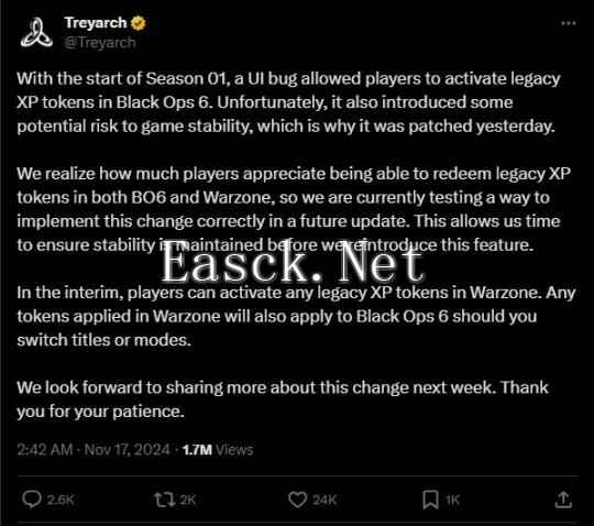 除此之外还有玩家发现,随着第一赛季的正式推出,游戏中还引入了系列传统的XP代币,不过Treyarch官方很快发布公告表示这是一个UI错误所导致的。 而官方也很快对这一问题进行了修复,随着新补丁的推出,XP代币又变得不再可用。对此Treyarch解释说:“随着第一赛季的开始,一个UI错误使得玩家可以在《黑色行动6》中激活旧版XP代币。不幸的是,这也给游戏稳定性带来了一些潜在风险,这就是昨天对其进行修补的原因。我们意识到玩家非常欢迎能够在《黑色行动6》和《战区》中兑换旧版XP代币,因此我们目前正在测试一种在未来更新中正确实施此更改的方法。”