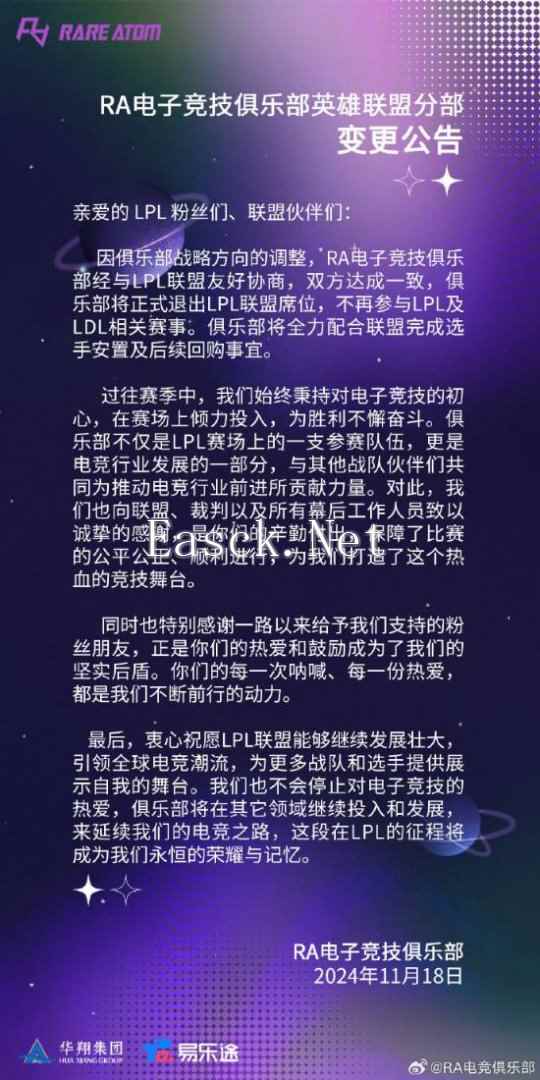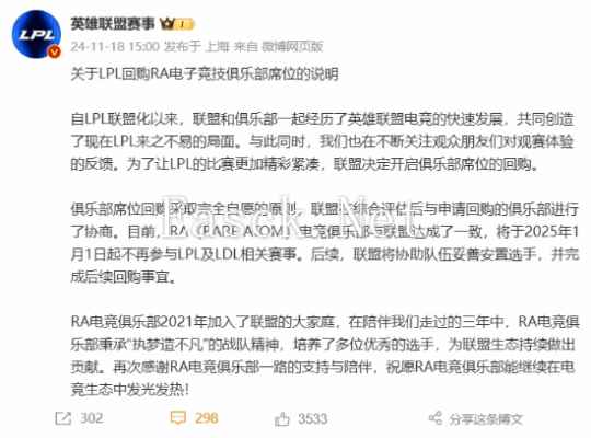 公告如下: 关于LPL回购RA电子竞技俱乐部席位的说明 自LPL联盟化以来,联盟和俱乐部一起经历了英雄联盟电竞的快速发展,共同创造了现在LPL来之不易的局面。与此同时,我们也在不断关注观众朋友们对观赛体验的反馈。为了让LPL的比赛更加精彩紧凑,联盟决定开启俱乐部席位的回购。 俱乐部席位回购采取完全自愿的原则,联盟在综合评估后与申请回购的俱乐部进行了协商。目前,RA(RARE ATOM)电竞俱乐部与联盟达成了一致,将于2025年1月1日起不再参与LPL及LDL相关赛事。后续,联盟将协助队伍妥善安置选手,并完成后续回购事宜。 RA电竞俱乐部2021年加入了联盟的大家庭,在陪伴我们走过的三年中,RA电竞俱乐部秉承“执梦造不凡”的战队精神,培养了多位优秀的选手,为联盟生态持续做出贡献。再次感谢RA电竞俱乐部一路的支持与陪伴,祝愿RA电竞俱乐部能继续在电竞生态中发光发热! RA官方发布的公告: