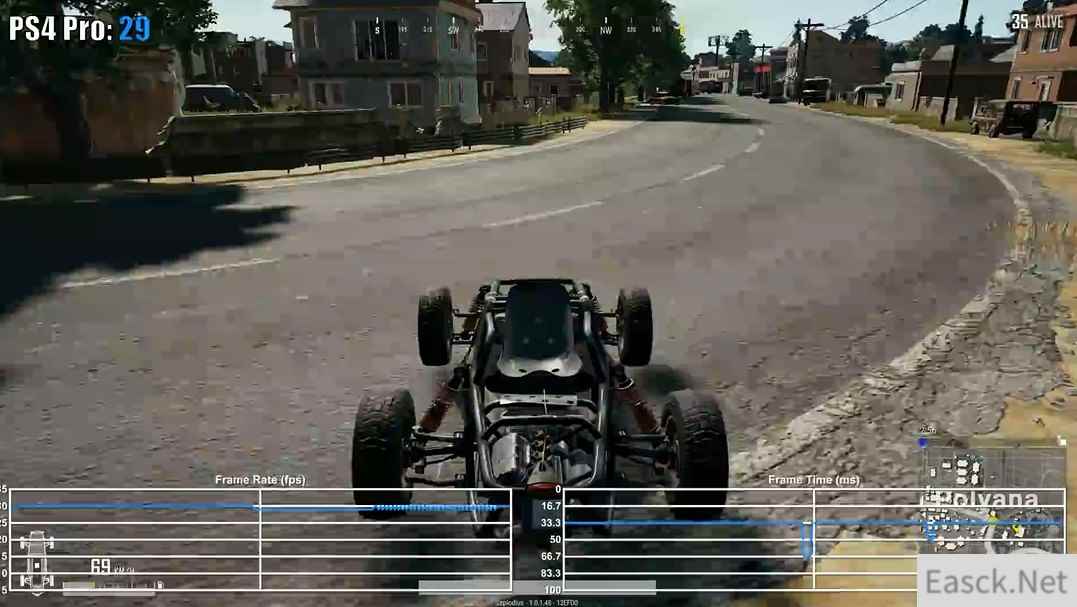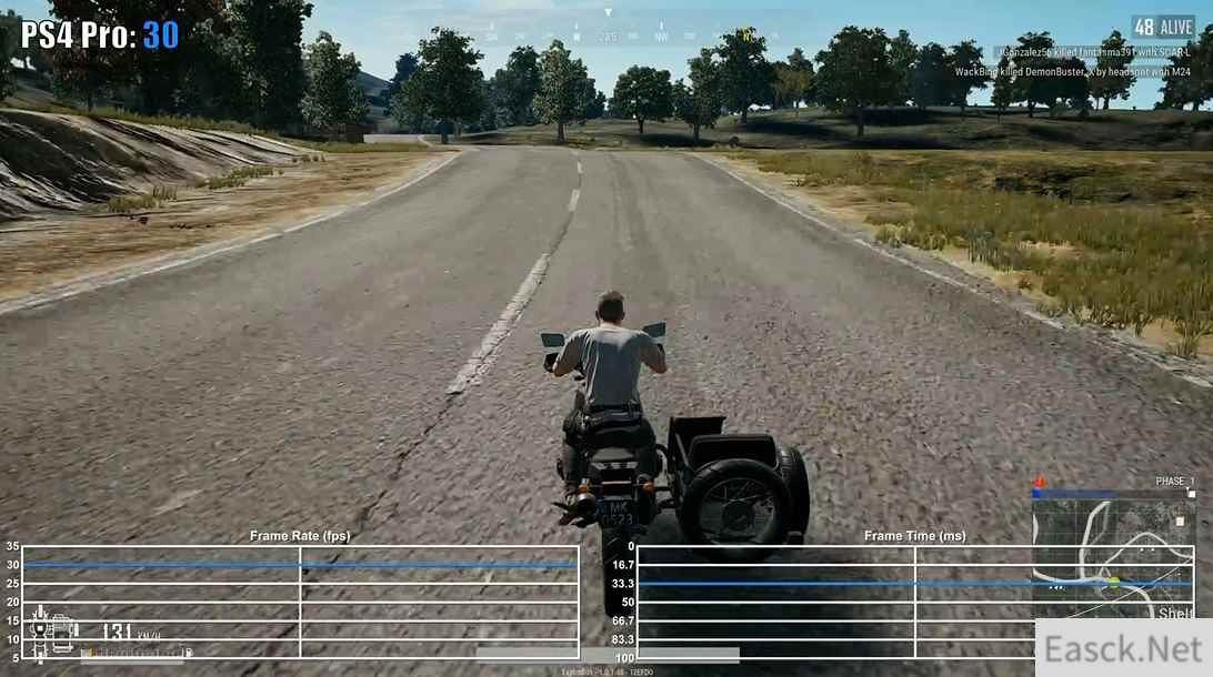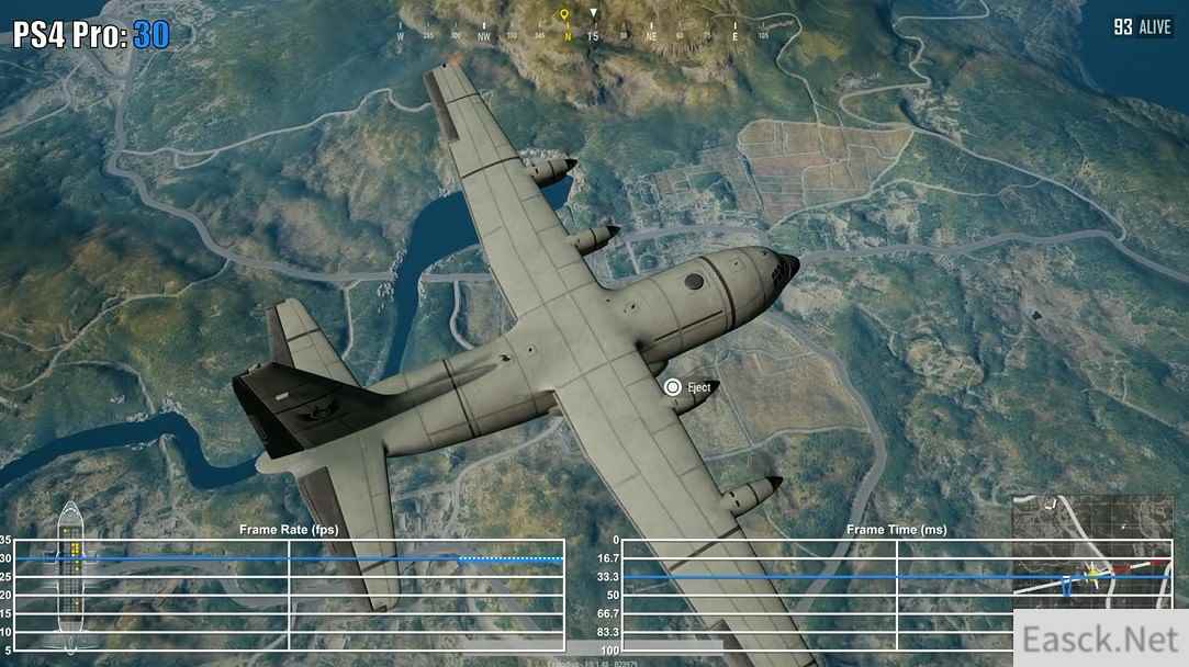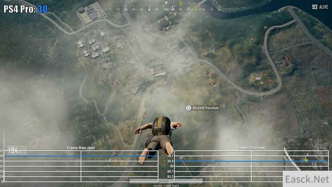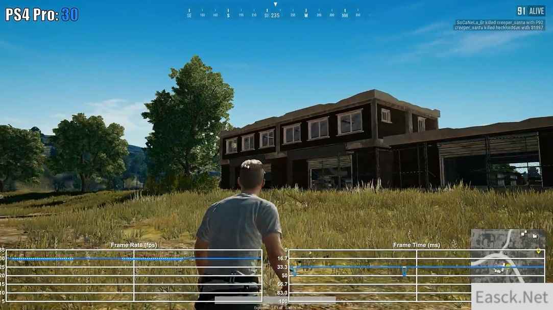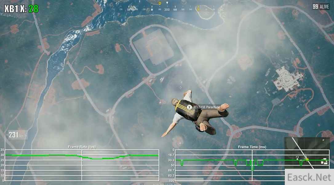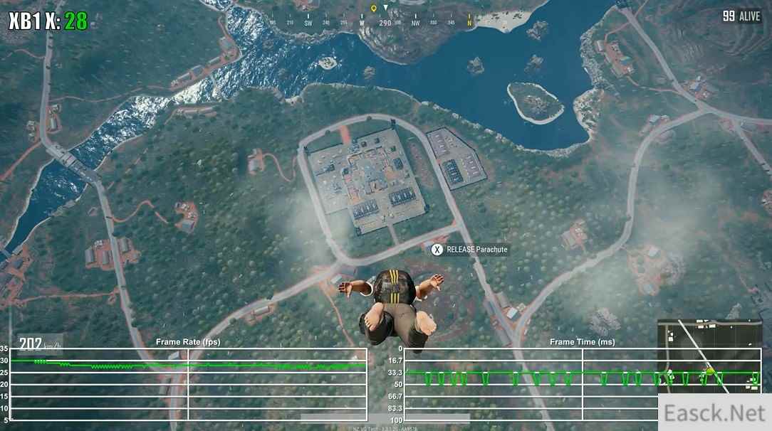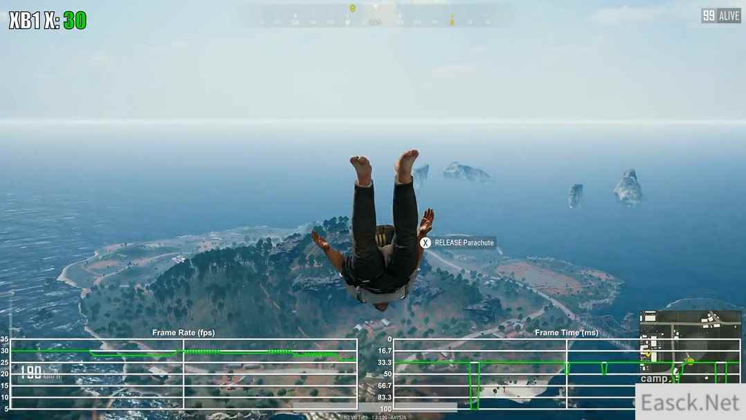 视频中可以发现,《绝地求生:大逃杀》在两大家用机平台上的表现都十分稳定,全程30帧吃鸡,但是Xbox One X版本却在跳伞时的帧数出现了不稳定的情况,帧生成时间也非常紊乱。虽然说全程稳定30帧,可主机版“吃鸡”的阴影和人物材质与贴图都不忍直视,但是更为干净的游戏环境,这些缺点也可以抛之不见了。 视频截图: