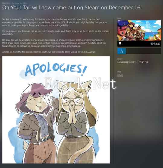 11月20日,叙事冒险游戏《On Your Tail》宣布将Steam版延期至12月16日发售,Switch版延期至2025年2月发售,该作原定于11月21日推出Steam版,官方给出延期理由是为了游戏能带来最佳的体验。