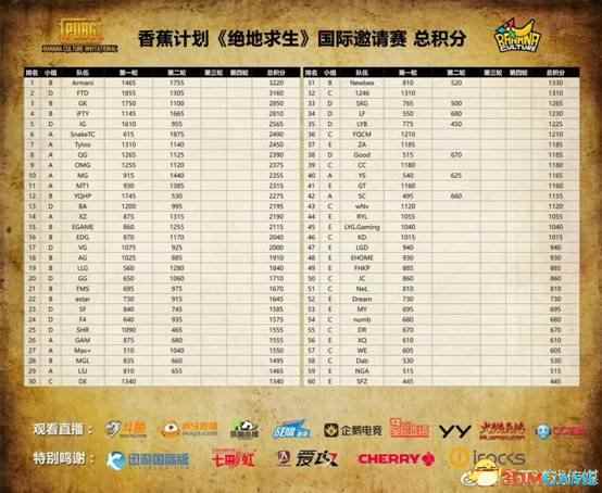 备受关注的香蕉计划 《绝地求生》国际邀请赛正如火如荼进行。25日,邀请赛第一周总积分出炉,Armani以3220分暂时领先,FTD和GK分别以3160分和2850分居第二、三名次。 此次邀请赛由香蕉游戏传媒主办,bluehole授权,迅游加速器作为全球领先的加速器为赛事提供赞助支持。据悉,本次赛事汇聚了国内60余支一线职业俱乐部以及五大平台当红热门主播共同参赛,包括老牌一线俱乐部的PUBG战队,WE、LGD、Snake、VG、iG、皇族、Tyloo、wNv、1246等均参与其中。
