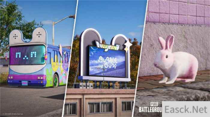 首先,PUBG的泰戈地图已改造成PUBG x NewJeans主题。泰戈的学校操场被改造成了户外表演舞台,玩家可以在这里使用PUBG x NewJeans的表情动作与NewJeans的MV视频进行互动。泰戈地图上的部分建筑被重新装修为唱片店,店内的唱机会播放NewJeans的歌曲。户外表演舞台和唱片店周围的区域都变成了“兔子”主题,整个地图内还布置了PUBG x NewJeans主题的巴士和广告牌。此外,在所有地图上,玩家都可以看到PUBG x NewJeans主题的卡车舞台、能量饮料、烟花、肥皂泡泡以及补给箱等元素。