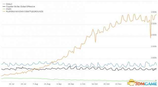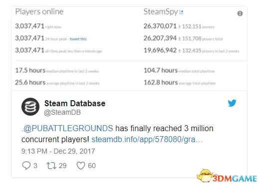 根据SteamDatabase的信息,《绝地求生》的同时在线玩家数量已经突破300万人。该游戏现在是2017年最为成功的PC游戏,在Steam上售出超过2500万份。