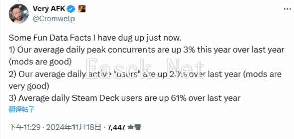 据悉,今年9月,官方在七号补丁更新中增加了官方MOD的支持,而此后其MOD下载量随之猛增,官方于10月底宣布MOD下载量突破5000万次。 |