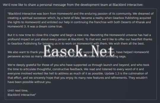 根据开发商Blackbird Interactive发布的最新开发者更新,《家园3》即将在11月21日上线1.3版本更新,这是一次重大更新,包含了大量改进、修复和一些全新功能,并且这次更新也将成为《家园3》的最后一次重大更新。 《家园3》1.3版本主要分为两个更新部分:战斗与平衡大修、小规模战斗和战争游戏变更及其他改进,这次更新也标志着官方完成了今年8月份承诺的游戏修复路线图,未来《家园3》不会再收到更多扩展内容,但错误修复更新、多人游戏和模组支持仍会继续提供。 接下来,Blackbird Interactive将开始新的篇章,具体是什么项目Blackbird Interactive没有透露。 |