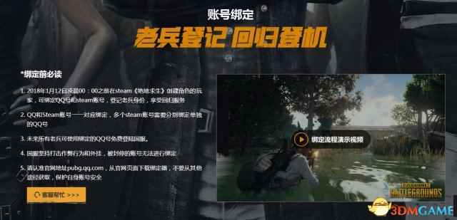 在2018年1月12日凌晨00:00之前在steam《绝地求生》创建角色的玩家,可绑定QQ号和steam账号,登记老兵身份,享受回归服务,QQ和Steam账号一一对应绑定,多个steam账号需要分别绑定单独的QQ号。未来所有老兵可使用绑定的QQ号免费登陆国服。国服坚持打击作弊行为和外挂,被封停的账号无法进行绑定。