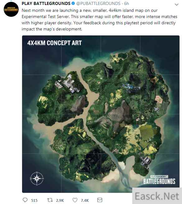 《绝地求生》官方推特日前公布他们下一个月会在测试服发布一张全新的,尺寸更小的的地图。这张地图尺寸为4x4km。这张小地图将提供更快,更紧张刺激的比赛节奏,玩家更加密集。玩家在测试期间的反馈信息将直接影响地图开发制作。 推特信息: