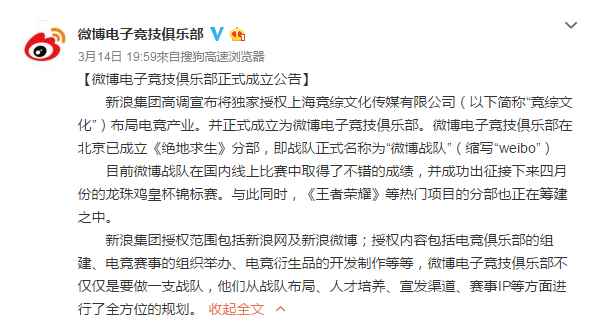 昨天,新浪集团宣布将独家授权上海竞综文化传媒有限公司(以下简称“竞综文化”)布局电竞产业。并成立为微博电子竞技俱乐部。