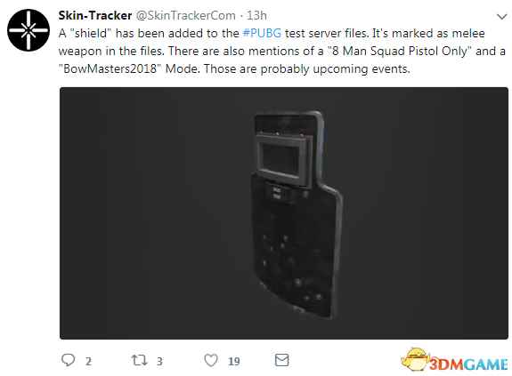 Skin-Tracker今天为我们曝出了《绝地求生》全新装备,“盾牌”已经加入《绝地求生》测试服。这个盾牌的数据文件被标记为混战武器。从视频来看,这个盾牌应该防暴盾牌,细节比较丰富,盾牌表面有很多弹痕。 此外文件也提到了“8人团队仅手枪”和“弓箭大师2018(BowMasters2018)”模式等字样。这也说明这些活动可能会在未来公布。 推特信息: