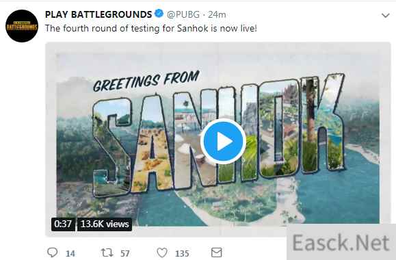 《绝地求生》官方推特今天发布了新地图Sanhok第四轮测试的火爆宣传片,现在新地图测试已经开启,玩家可以进入测试服体验新图。在这段宣传片中,玩家可以感受到新地图清新的视觉效果,在这篇青山绿水覆盖的岛屿上,吉利服可以大显神威,视频演示中就有一名穿着吉利服的玩家躲在灌木丛里,神不知鬼不觉地杀了2名玩家。