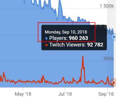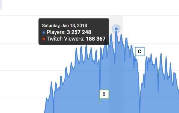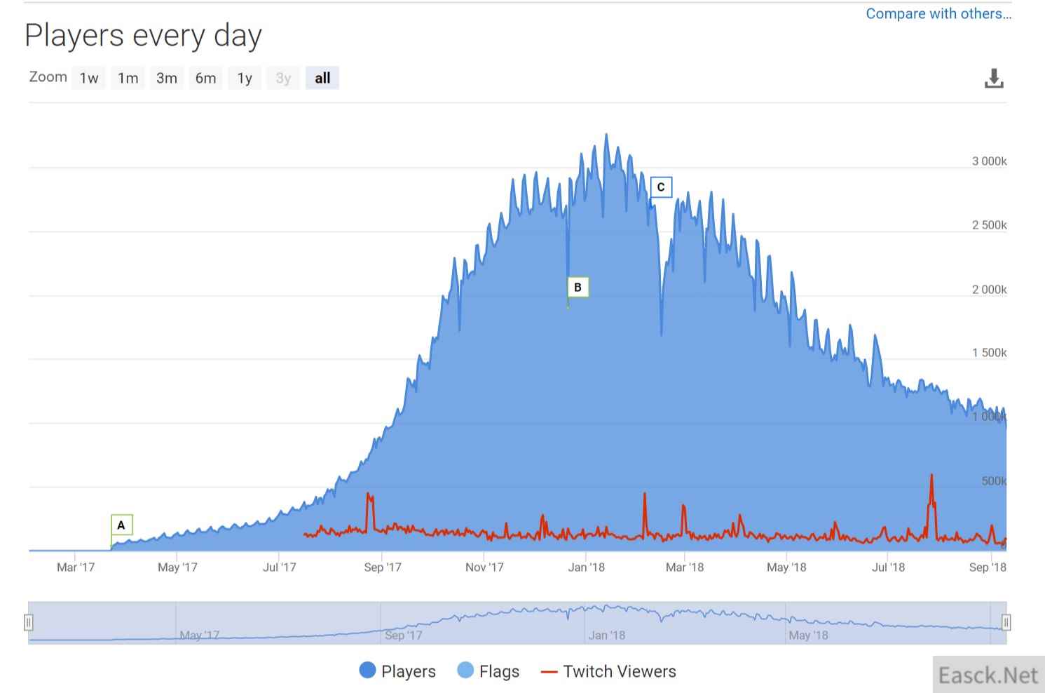 具体来说,昨天《绝地求生》的在线玩家数量为96万左右,相比今年1月时的320万巅峰期,可以说跌幅相当大。 如上图,这是《绝地求生》在Steam上的在线玩家统计。 其中A代表2017年5月登陆Steam抢先体验的这一天,玩家人数接近4万(39523),B代表的是离开抢先体验正式在Steam发售的这一天,当时的在线人数为190万,C代表《绝地求生》手游发售的这一天,当时的在线人数为270万。 根据以上图表,《绝地求生》在2018年1月13日到达巅峰,在线人数达到了325万7248人。随后游戏的在线人数总体趋势是在下滑,到了9月10日,在线人数为96万263人,这是自2017年9月8日以来,游戏在线人数首次跌破100万。