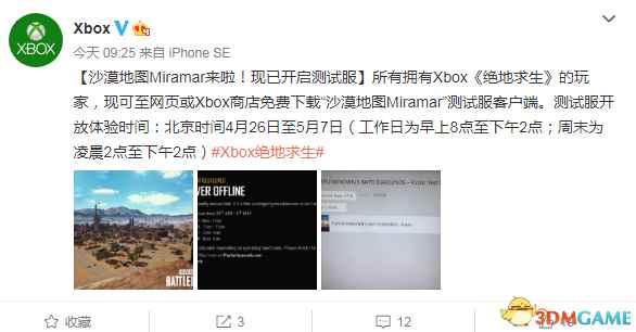 Xbox官方微博今天公布沙漠地图Miramar现已开启XB1测试服,所有拥有Xbox One版《绝地求生》的玩家,现在可以至网页或Xbox商店免费下载“沙漠地图Miramar”测试服客户端。 测试服开放体验时间:北京时间4月26日-5月7日。(工作日为早上8点至下午2点;周末为凌晨2点至下午2点)。 Xbox One版《绝地求生》的最大优势是没有外挂,当然“劣势”就是手柄操作。 官方微博: