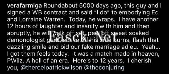 今天,热门恐怖片系列新片《招魂4》官宣杀青!维拉·法米加在ins发文感慨与帕特里克的合作,一起来看看吧! “大约5000天前,我和这个家伙签署了一份华纳电影公司的合同,都说了‘我愿意’扮演埃德·沃伦和洛林·沃伦。今天,他杀青了。我还有12个小时和他一起欢笑和疯癫,然后,他会突然走下片场,脱掉被汗水浸透的魔鬼学家的服装,刮掉侧面的烫伤粘贴物,露出耀眼的笑容,向我们的假结婚告别。是啊……我今天感受到了,这真是天作之合,也是一个时代的地狱,为12年干杯,我珍重你,帕特里克·威尔森、《招魂》系列。” 该片是最后一部《招魂》,名为《The Conjuring: Last Rites》,已定档2025年9月5日北美上映。迈克尔·查韦斯(《招魂3》《修女2》)执导,大卫·莱斯利·约翰逊-麦戈德里克(《招魂2/3》《海王2》《孤儿怨》)写剧本,温子仁继续担任制片人。 |