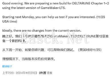 《传说之下》和《三角符文》(DELTARUNE)制作人 Toby Fox 透露,他和团队正在准备《三角符文》第1章和第2章的新版本,新版本将于11月25日(星期一)开放测试。 新版本的前两章内容其实是基于更新后的游戏引擎GameMaker LTS(今年7月发布)重新构建。据悉,除了引入GameMaker LTS的新功能外,重制的《三角符文》第1章和第2章在内容上没有任何变化。 上个月,Toby Fox确认《三角符文》第3章和第4章预计将在2025年发布。目前,《三角符文》第1章和第2章的已发布版本可在PC/Mac(Steam)、PS4和Switch上免费下载游玩。 |