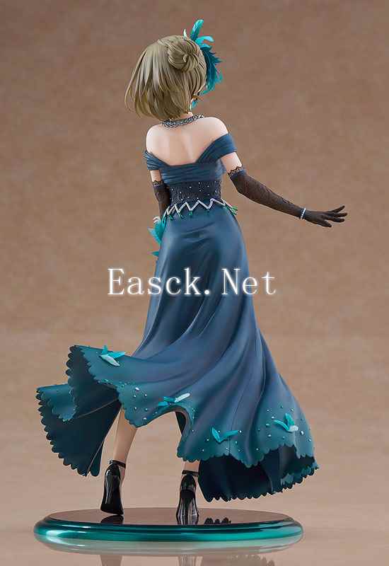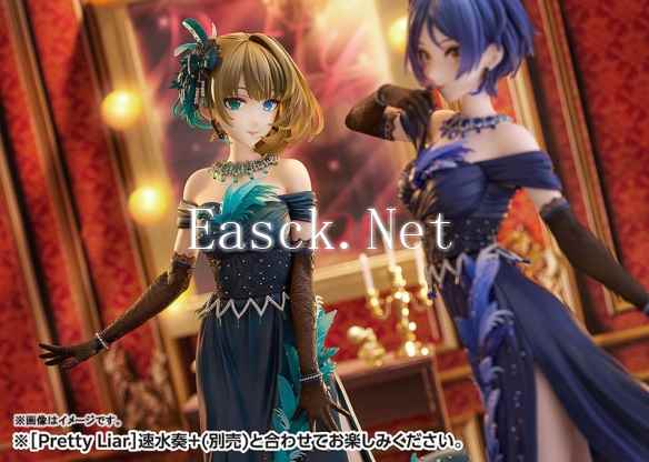 手办采用了游戏中“Mysterious Eyes”的组合曲《Pretty Liar》中长裙姿态进行立体化。丽人一头墨绿色短发采用了半透明材质打造。身穿高贵美丽的蓝色长裙,胸口与裙摆上的淡蓝色羽毛以及首饰的珠宝都采用了半透明件打造出华丽感。黑色手套上点缀着蕾丝花纹。长裙的高衩之下,一双修长白皙的腿尽情展现在玩家面前。