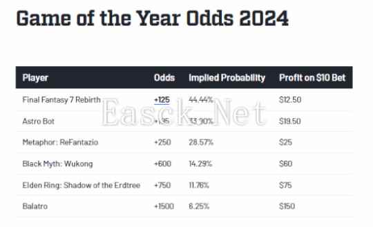 其中排名第一的是《最终幻想7:重生》,赔率为+125,获胜概率预测为44.44%。《黑神话》排名第四,赔率为+600,获胜概率为14.29%。而《小丑牌》最不被看好,获胜概率仅为6.25%。