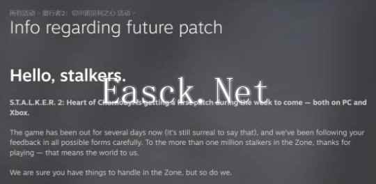 《潜行者2:切尔诺贝利之心》在上线后非常火爆,作为一款首发XGP的作品,游戏的首发销量也超过了百万份。不过因为存在的各种BUG,《潜行者2》并没有收获预期中那么多好评,在Steam的评价目前为“多半好评”(78%好评)。而现在,GSC官方终于宣布首个补丁将在下周上线,修复大量问问题。