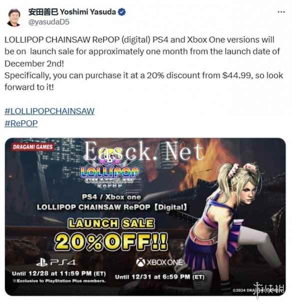 游戏制作人安田善已公布消息,PS4及Xbox One平台的《电锯糖心RePOP》定于12月2日正式推出,且仅以数字版形式发售,售价为44.99美元。游戏首发期间,将提供为期约一个月的20%折扣优惠。