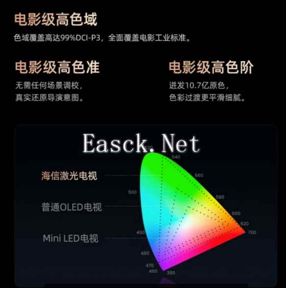 其次,上文介绍了选百吋电视所追求的就是和影院一样的沉浸感,在这方面海信激光电视星光S1 100英寸也很有优势。首先,它的核心是采用了激光光源和DLP®数字放映技术,这些技术与高端的激光电影院同源,能够1:1还原影院观感。另外,我们可以看到它公布的色域值能够达到99%DCI-P3,这比一般高端电视95% DCI-P3的色域值要高,而色域越高,所能展现出来的颜色就越多,色彩就更真实,细节也更丰富。此外,对于喜欢IMAX的朋友来说也有一个好消息,就是这款海信激光电视星光S1已通过IMAX Enhanced认证,通过内置的4K MAX影片库和专区就能轻松享受到IMAX影院的惊艳画质。