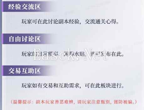 *注:论坛仅在玩家完成副本后开放使用,副本期间无法使用玩家论坛功能。 --论坛板块-- 论坛内分区设置了多个不同的功能板块,玩家可选择相应的板块,浏览其他副本玩家的讨论与分享。