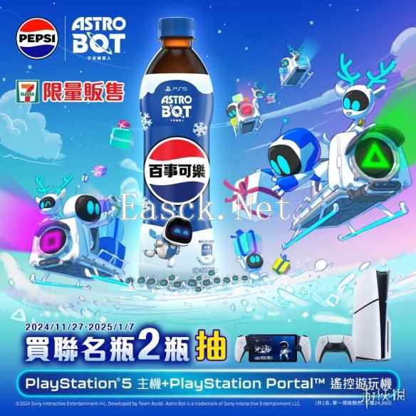 此款联动百事可乐采用《宇宙机器人》角色,结合雪花飘飘的圣诞主题包装。只要在2024年11月27日至 2025年1月7日期间购买 2 瓶,并在活动网站登录发票,就可以参加抽奖,有机会抽中 PlayStation 5 slim型主机 + PlayStation Portal豪华组合(只有1名,两台游戏机市价8500元) 。