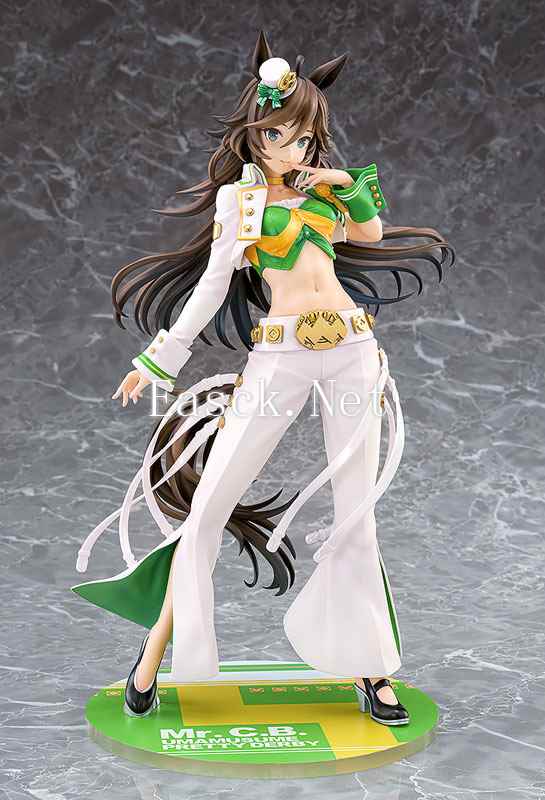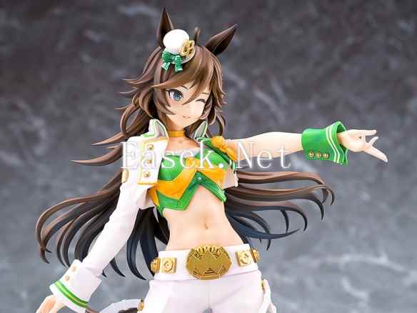 手办采用了赛马娘“千明代表”身穿胜负服“Clear Bliss”的姿态登场。喜欢自由奔跑的赛马娘一头棕色长发在身后飘舞,头上竖着长长的马耳,一旁点缀着白色礼帽,脸上展露着余裕的表情。漂亮的白色外套搭配上绿色抹胸上衣将纤细的腰肢与小腹轮廓都展现在玩家面前。下身修长笔挺的喇叭裤也是相当帅气。手办附带有飞吻手臂与眨眼表情替换件。