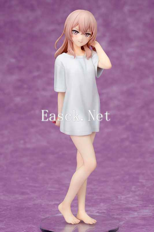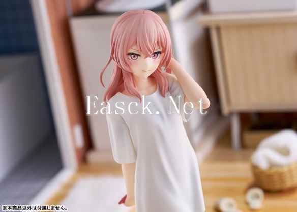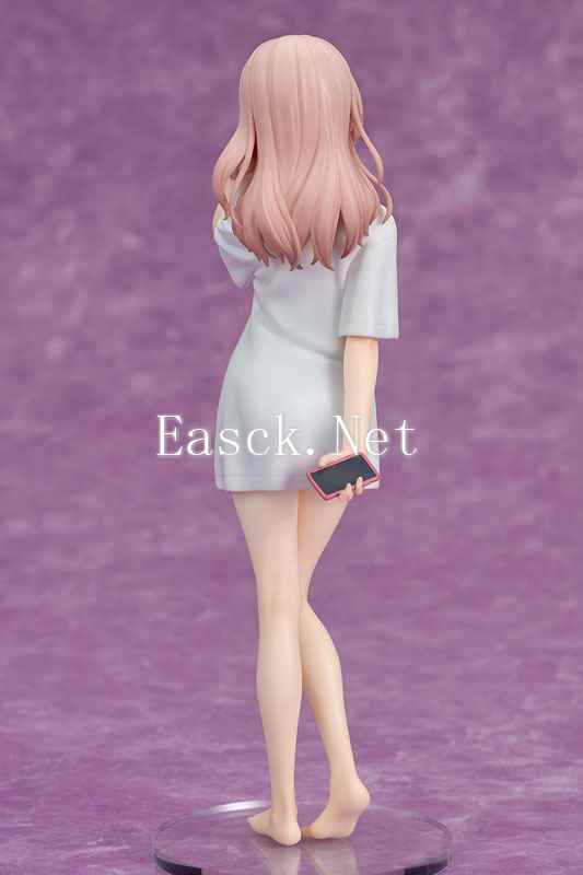 以“朱朱”为化名活动的高人气美少女Cosplayer乾纱寿叶以动画第六集中洗澡后身穿男主角五条新菜的男式T恤造型进行立体化。朱朱一头粉色的长发垂在肩头。白色的男式T恤褶皱与贴上肌肤的隐约身体曲线也都进行了刻画。宽松的衣摆下,大腿延伸至脚尖的曲线看起来吹弹可破。手里的手机外壳纹理也没有落下。