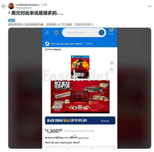 Reddit论坛有玩家趁着黑五逛亚马逊时发现,发售六年的《荒野大镖客:救赎2》典藏版的售价变得非常高,足足有1300美元(约人民币9415元),简直贵得离谱。