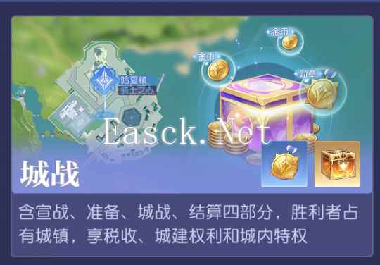 玩家需要先加入三大阵营中的一个,而后经过前期的准备预热,以公会为单位,累计城市影响力,同阵营影响力最大的公会,会成为该阵营的领袖!准备阶段过后,影响力最大的成为守城方,影响力排名第二的成为攻城方。而后,便是迎接在城战日的到来,对抗对手阵营,杀人夺旗,占点抢水晶!