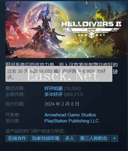 可在今年发布的诸多新游戏中,却有这样一朵奇葩。自上线以来,它就在“好评如潮”和“差评如潮”间反复横跳。巅峰时Steam好评率能冲上95%,低谷时又能日增差评10万条。靠着更新,开发商完全拿捏了玩家,而这款游戏就是由箭头工作室制作的《绝地潜兵2》。