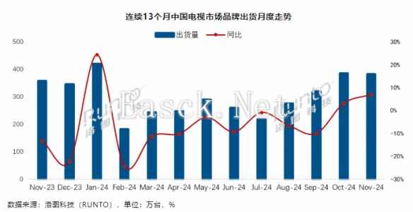 据洛图科技发布的《中国电视市场品牌出货月度快报》数据显示,2024年11月,中国电视市场品牌整机出货量为381.5万台,环比小幅下降1.0%,同比实现增长6.9%。