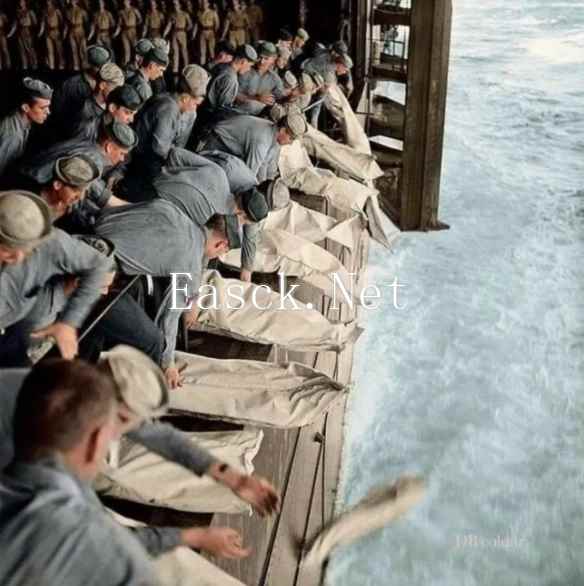 1944年11月,无畏号航母上的海葬,白色的布袋装着阵亡的士兵的遗体,船上的美军正把这些尸袋抛下大海,这是当时海军的最高荣誉葬礼。