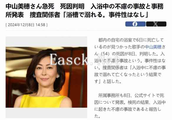 日前,经典影片《情书》中的女主角扮演者中山美穗被曝在家中去世,今天,日媒公布了她的死因:“洗澡时意外溺水身亡”,并非自杀。