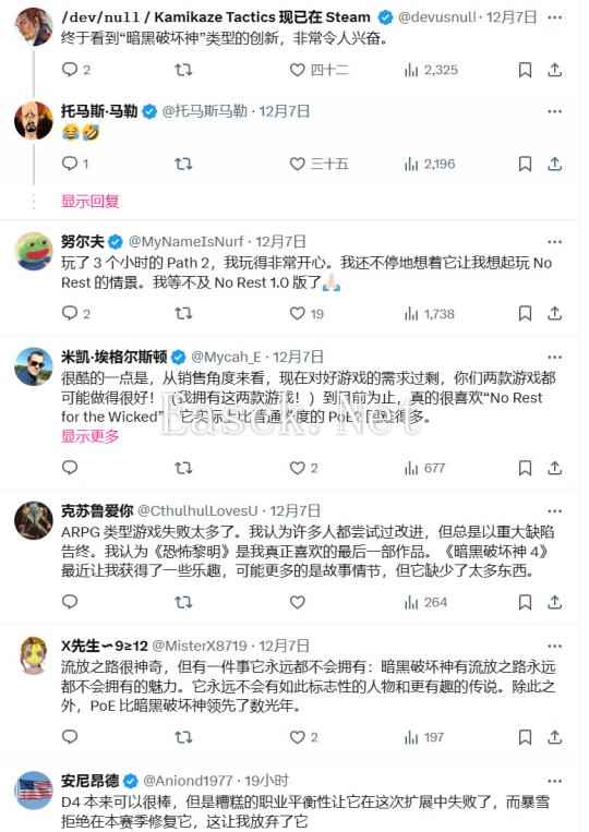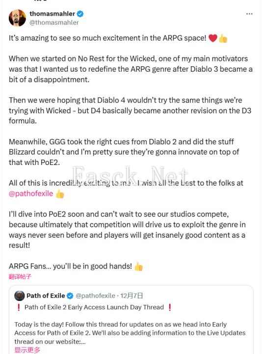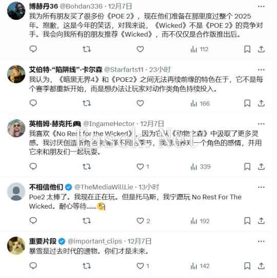 曾经想通过《恶意不息(No Rest for the Wicked)》重新定义动作RPG游戏的《奥日》主创@thomasmahler近日发帖,大赞开发商GGG做到了暴雪无法做到的事情,他深信暴雪下一步会借鉴POE2。 他说: “看到ARPG领域如此热烈,实在令人惊讶! 当我们开始制作《恶意不息》的时候,我的主要动机之一是,在《>暗黑3》变得令人有点失望之后,我希望我们能重新定义ARPG类型。 然后我们希望《暗黑4》不会尝试和《恶意不息》相同的东西 - 但《暗黑4》基本上成了《暗黑3》的另一个修正版。 与此同时,GGG从《暗黑2》中得到了正确的启发,做了暴雪做不到的事情,而且我很确定暴雪会在《流放之路2》的基础上进行创新。 所有这一切都让我感到非常兴奋 - 我祝《流放之路2》的开发团队们一切顺利。 我很快就会游玩《流放之路2》,已经等不及想要看到工作室之间的竞争了,因为竞争最终会驱使我们以前所未有的方式开发这一游戏类型,玩家也会因此获得绝佳的内容! ARPG游戏粉丝们......你们将会得到很好的照顾!”