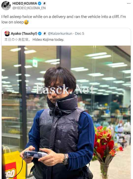 小岛秀夫的助理经常在推上分享小岛测玩《死亡搁浅 2》的照片,他经常嘴巴里含着某东西,有一次还被贴满了贴纸。近日,小岛秀夫发推文称:“我在送货时睡着了两次,结果把车撞到悬崖上。我睡眠不足。”
