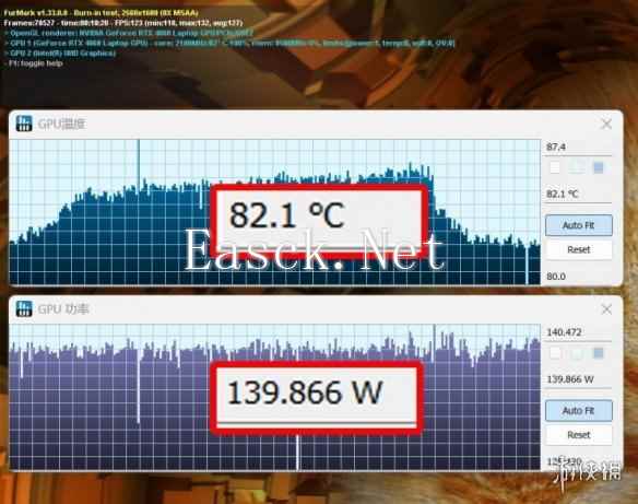 FurMark GPU单拷机可以看到,暗影骑士·擎6可以让GPU在140W功耗状态下稳定运行,且核心温度平均仅为82.1℃,整体表现出色。