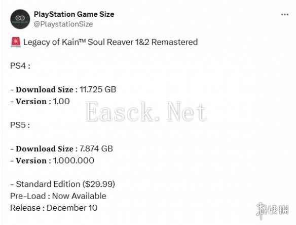《凯恩的遗产:勾魂使者 1&2 重制版(Legacy of Kain Soul Reaver 1&2 Remastered)》即将于12月11日正式发售,数据博主@PlaystationSize透露了本作在PS平台的容量大小,快来了解下吧。 据悉,《凯恩的遗产:勾魂使者 1&2 重制版》在PS4平台所需11.725 GB,版本号为1.00;在PS5平台所需7.874GB,版本号为1.000.000。游戏现已开启预载,感兴趣的玩家快去前往下载吧。 本作将带来更好的3D模型、更高质量的纹理和更好的光照系统,总的来说,它有点类似于之前的《古墓丽影1-3复刻版》。游戏中,玩家将扮演阿兹瑞尔,玩家将用角色的爪子、心灵能量弹和元素鬼魂之刃来消灭他们昔日的吸血鬼同族。为了变得更强大,玩家需要吞噬敌人的灵魂。 《凯恩的遗产:勾魂使者 1&2 重制版》将登陆PS5、Xbox Series X/S、PS4、Xbox One、任天堂Switch和PC平台。 |