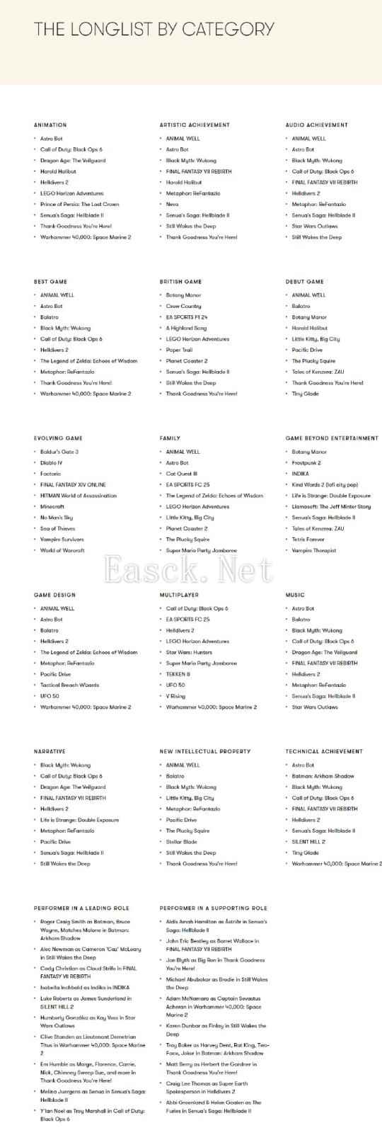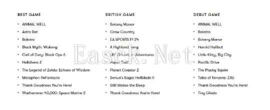 以下是BAFTA年度最佳游戏提名名单: 动物井 宇宙机器人 小丑牌 黑神话:悟空 使命召唤:黑色行动6 地狱潜者2 塞尔达传说:智慧的再现 暗喻幻想 Thank Goodness You're Here! 战锤40K:星际战士2