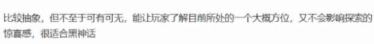 当然,地图本身并不过分详细,能够让玩家了解目前所处的大致方位,同时也能保留探索过程的惊喜感。 玩家评论: >