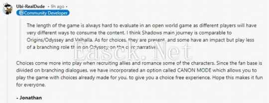 近日《刺客信条:影》开发者在 Reddit 论坛举办问答活动,被玩家问及与《起源》《奥德赛》和《英灵殿》相比,《刺客信条:影》主线时长有多长。创意总监乔纳森・杜蒙特 (Jonathan Dumont) 回答称:“对于开放世界游戏而言,游戏时长总是很难评估,因为不同玩家会用不同方式来游玩。我认为《影》主线时长能与《起源》《奥德赛》和《英灵殿》相媲美。”