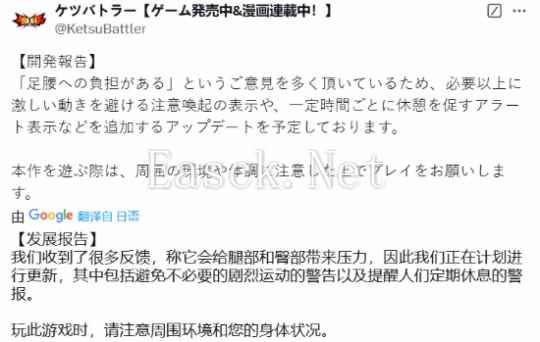 官方随后发文表示,已经收到了玩家的反馈,将很快发布新更新,加入关于适度游戏谨防剧烈运动所导致足腰损伤的游戏提示,而且提醒玩家注意游戏时的周围环境以及自身的状况。