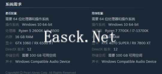 该作需要100GB硬盘可用空间,内存要求16 GB。显卡最低需要GTX 1060,推荐RTX 4070 SUPER。