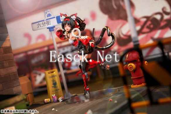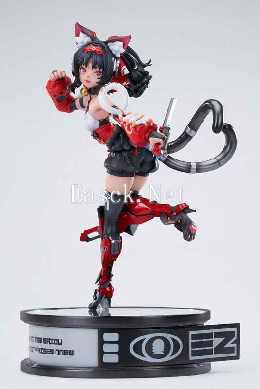 帆布巷出身的孤儿的猫宫又奈以游戏中的默认人设进行立体化。黑色的长发扎着一个蓬松的马尾,黑色的猫耳之上还点缀着红色装饰。无袖的上衣,白色胸口与红色腹部勾勒出小腹的纤细轮廓,活动中的褶皱细节也没有落下。黑色的短裤下红色的装甲护腿下,鞋底可爱的桃色肉垫对比鲜明。背后的两根黑色尾巴翘起犹如比心姿态。