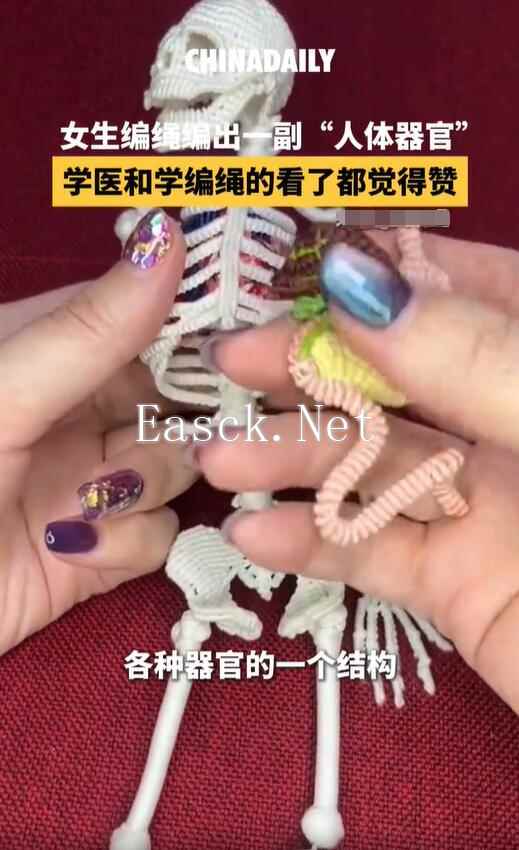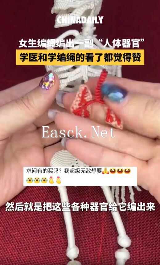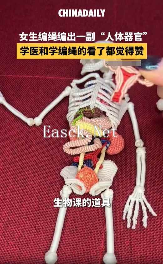 近日,广东揭阳一女生手工编织“人体器官”,“五脏六腑”都是编织的。学医和学编绳的看到都震惊了…… 当事人称:作品是一位老师找我定制的生物课的教具,需要清楚地向学生展示各种器官的结构。我是参考了很多的医学笔记之后,然后把这些各种器官给编出来。