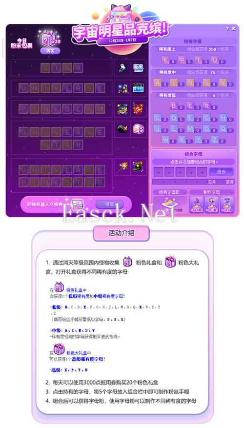 宇宙明星品克缤登场!速速加入粉丝团为它应援吧! 2024年12月25日起至2025年1月7日,接取[宇宙明星]宇宙明星品克缤登场任务,帮助品克缤成为宇宙明显,通过消灭等级范围内怪物收集粉色礼盒和粉色大礼盒,打开礼盒获得不同稀有度的字母,收集字母完成为宇宙明星品克缤加油的粉丝手幅时,就能获得品克缤的礼物!