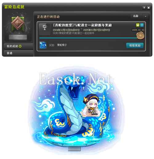 青蛇的愿望,与蛇道士一起迎新年吧~ 2024年12月31日至2025年1月1日,在主要村庄处找到NPC蛇道士,接取[青蛇的愿望]与蛇道士一起迎新年任务,听取新年祝福,即可在冒险岛成就中获得青蛇椅子奖励。