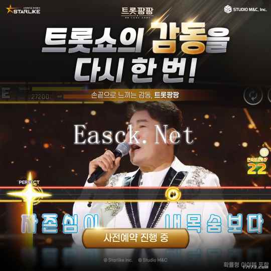 由韩国游戏公司Starlike与Studio MNC合作开发的音乐游戏《Trot Pangpang:应援最爱歌手》(以下简称,应援最爱歌手)日前开启韩国地区的预约。
